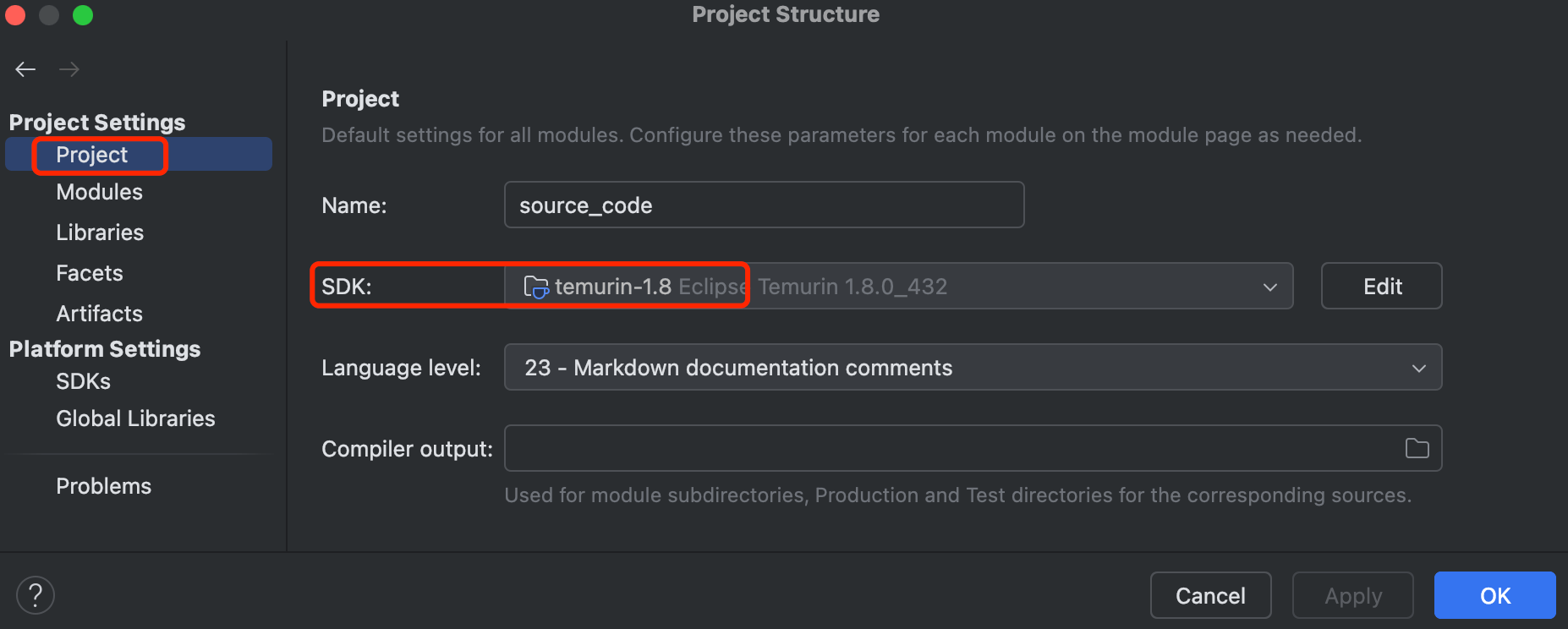 在弹出的窗口中,选择左侧的 Project,确认 Project SDK 已经设置为正确的 Java 版本(例如 JDK 8、JDK 11、或其他版本,取决于你项目的需求)。