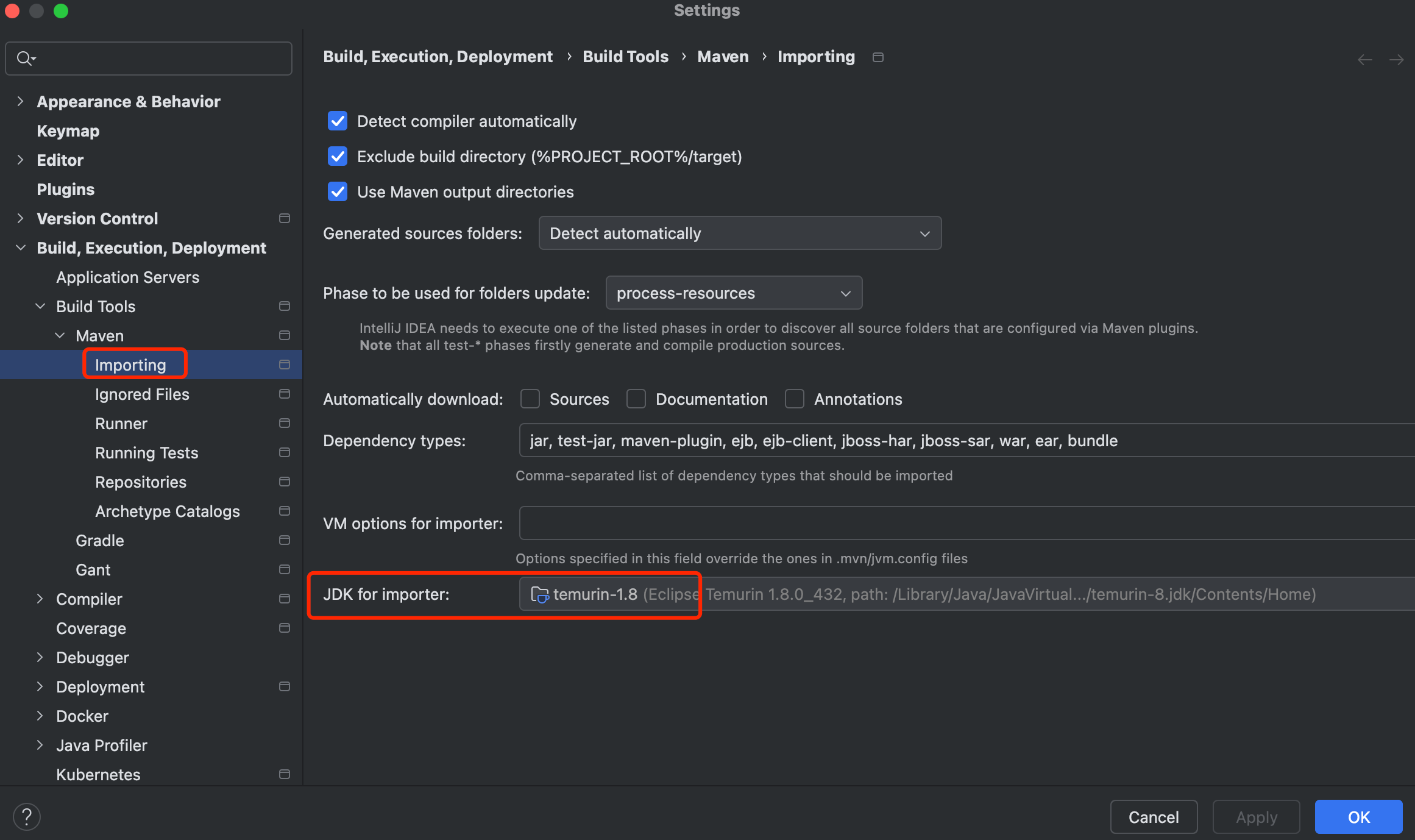 确认 JDK for importer 设置为正确的 JDK 版本。
