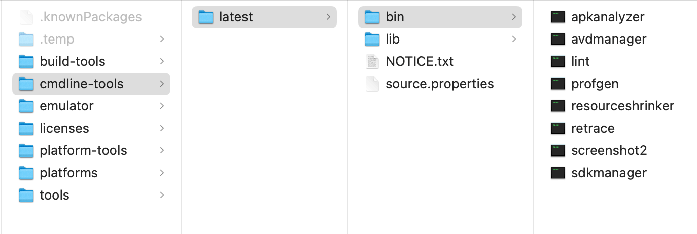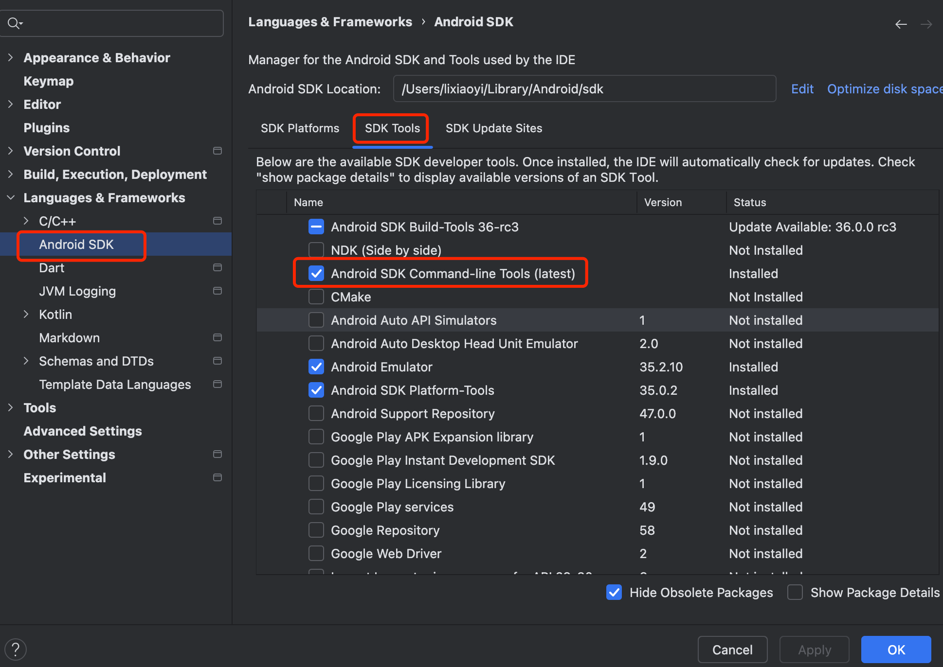 进入目录:/Users/your_username/Library/Android/sdk/cmdline-tools/latest/bin,执行下列命令手动安装SDK