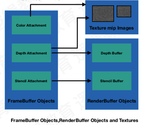 Frame Buffer对象实际上不是缓冲区,而是包含一个或多个附件的聚合器对象,而这些附件又是实际的缓冲区。您可以将Framebuffer理解为C结构,其中每个成员都是指向缓冲区的指针。