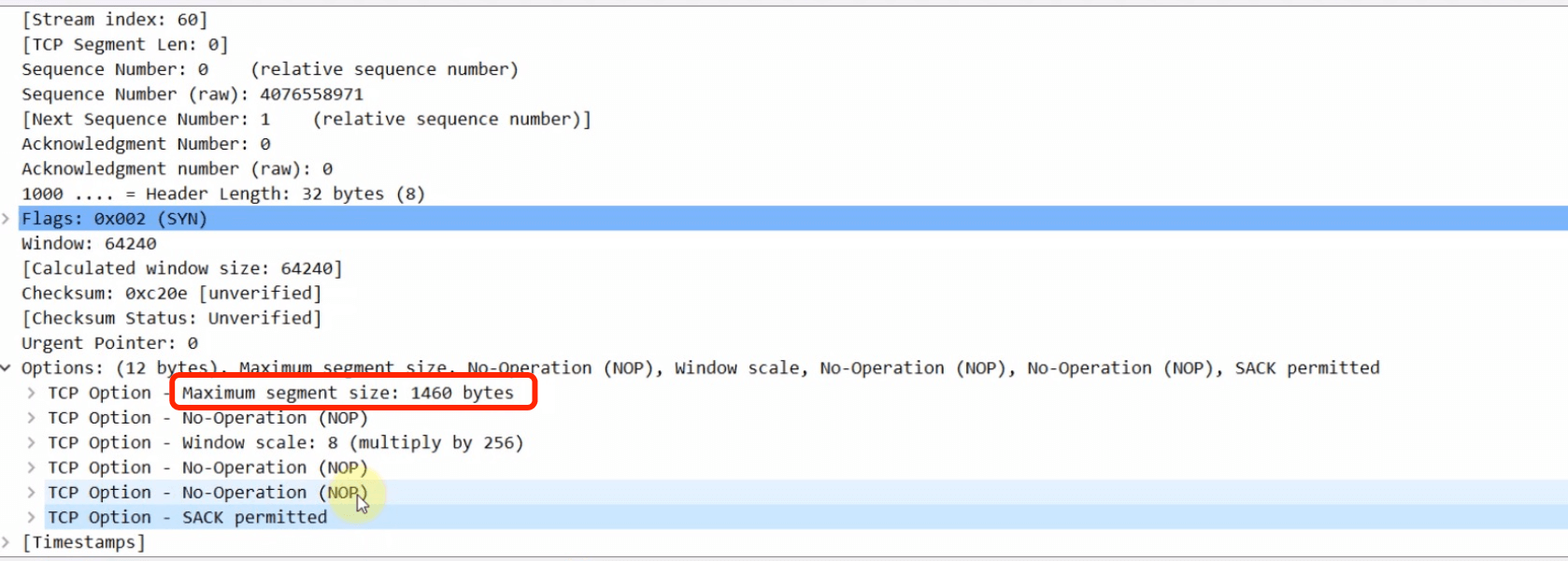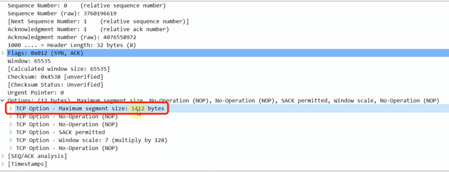 MSS(Maximum Segment Size):每个段最大的数据部分大小,在建立连接时确定(比如接收端每个段的大小为1460,发送端每个段的大小为1412)