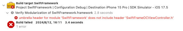在Framework内部,oc代码要想被swift代码调用,需要将oc代码的头文件声明放在伞文件内,但放在伞文件内需将oc的头文件放在 Build Phases - Headers - Public内