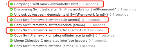 xy:我们手动将SwiftFramework中的module.modulemap文件移走,app target照样能正常运行,所以起作用的还是SwiftFramework.swiftmodule.猜测SwiftFramework在编译过程中将SwiftFrameOCViewController.h头文件信息以某种方式打包进了SwiftFramework.swiftmodule文件内
