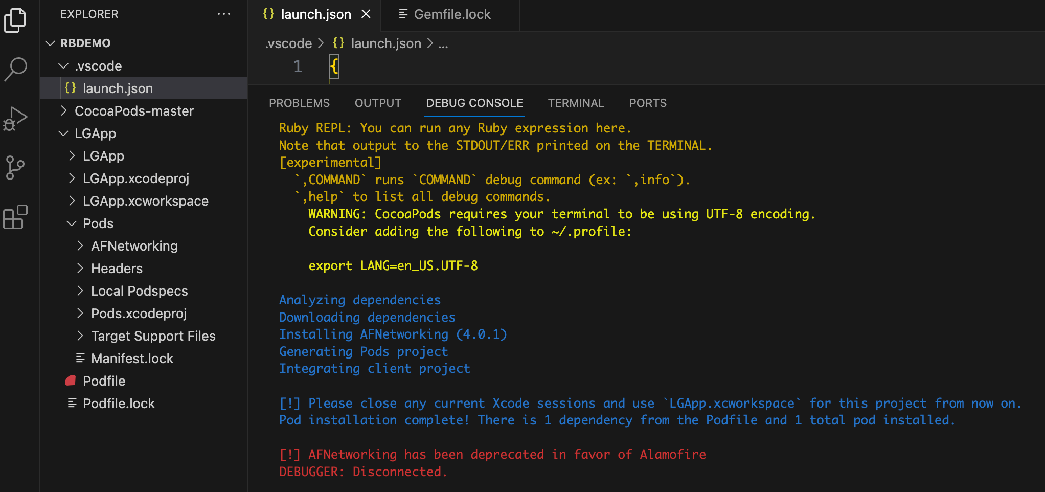 启动调试器,我们就可以使用CocoaPods项目中的pod来管理我们的ios项目了,而不是使用系统中安装的pod