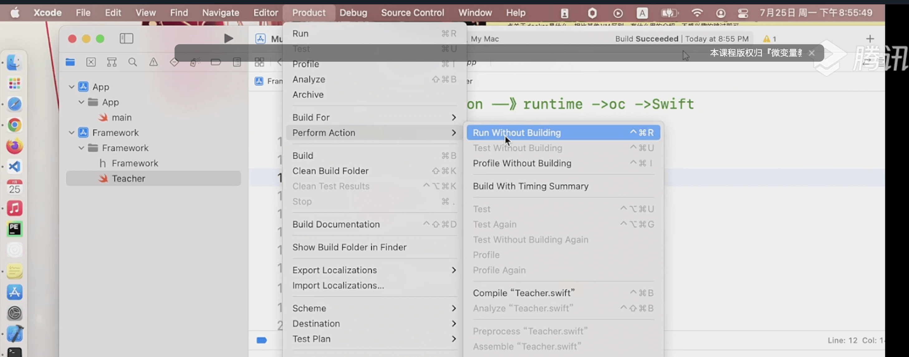 但当swift库的代码Teacher.kody=”工程化”修改编译后,app工程不编译直接运行