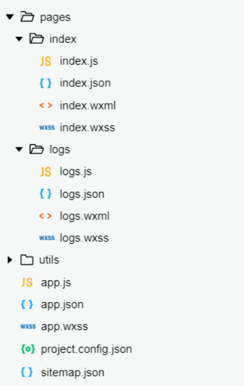 小程序官方建议把所有小程序的页面,都存放在 pages 目录中,以单独的文件夹存在,如图所示:
