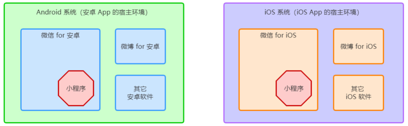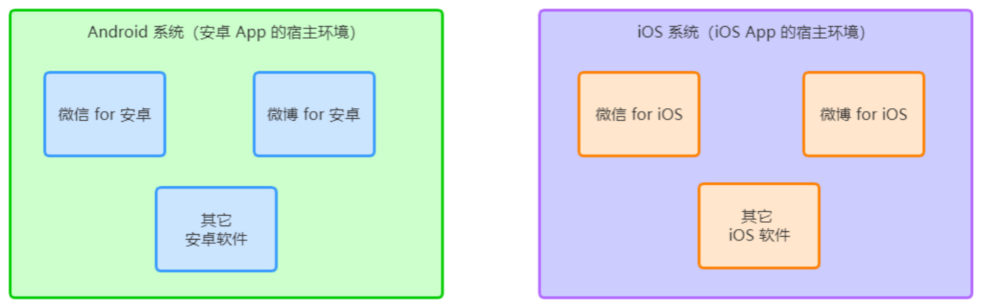例如:Android 系统和 iOS 系统是两个不同的宿主环境。