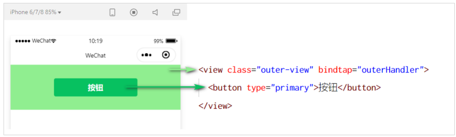 点击内部的按钮时,点击事件以冒泡的方式向外扩散,也会触发外层 view 的 tap 事件处理函数。