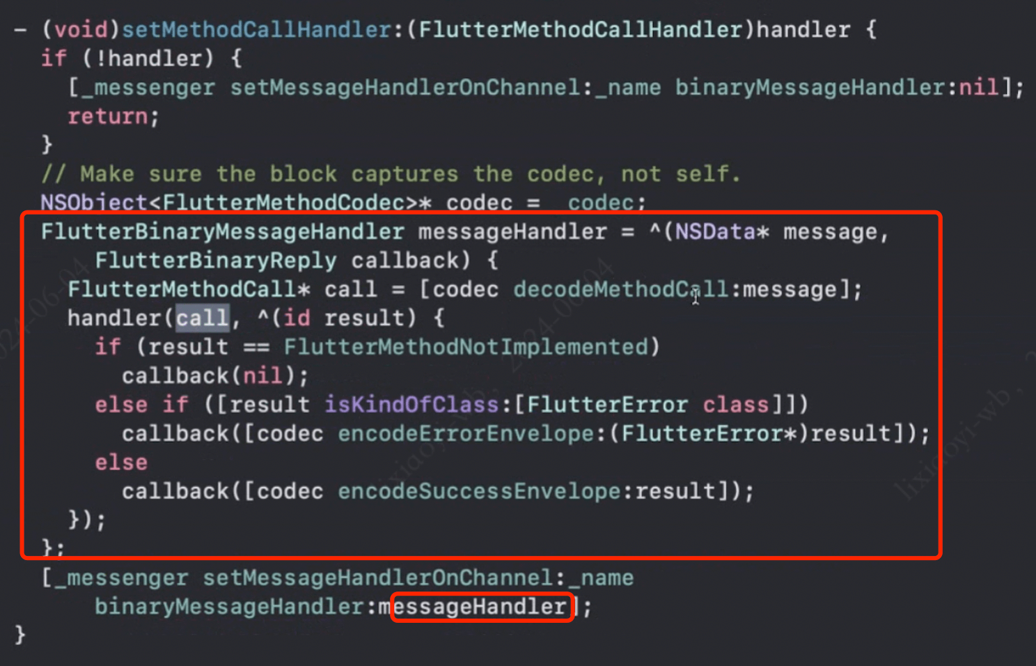 [self.flutterInitChannel setMethodCallHandler:^(FlutterMethodCall * _Nonnull call, FlutterResult _Nonnull result) {
