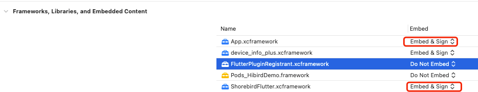 注意生成的是动态库还是静态库,并且App.xcframework和ShorebirdFlutter.xcframework需要 Embed & Sign