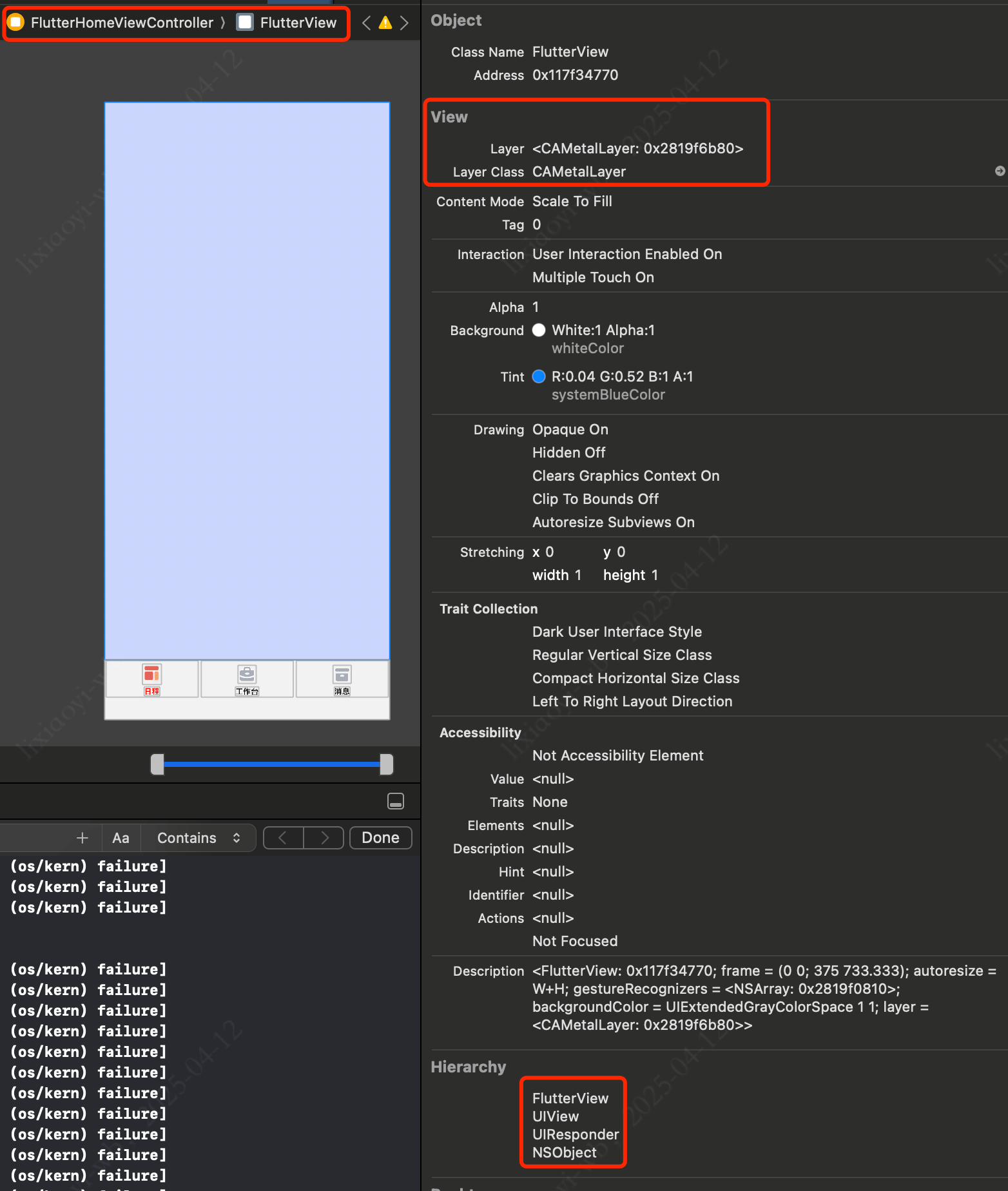 2、Flutter这块画布自己不知道展示在哪里,要想展示出来,就要写入一个CAMetalLayer。而这个CAMetalLayer就是FlutterViewController.view.layer。