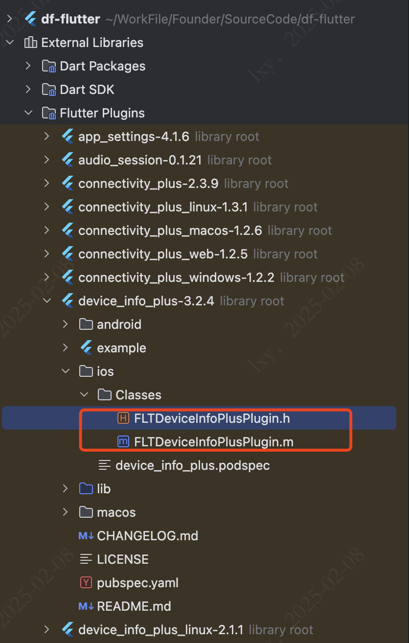 实际的目录是:/Users/lxy/.pub-cache/hosted/pub.flutter-io.cn/device_info_plus-3.2.4/ios/Classes/FLTDeviceInfoPlusPlugin.h