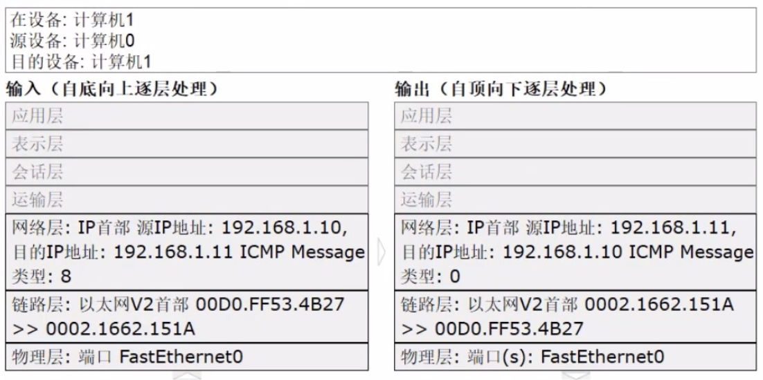 icmp数据包:源ip地址、目标ip地址、源mac地址、目标mac地址,发送给交换机,交换机发送给对应主机