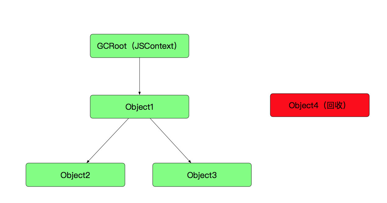 不同于OC的引用计数,Tracing Garbage Collection是由GCRoot(Context)开始维护的一条引用链,一旦引用链无法触达某对象节点,这个对象就会被回收掉。如下图所示: