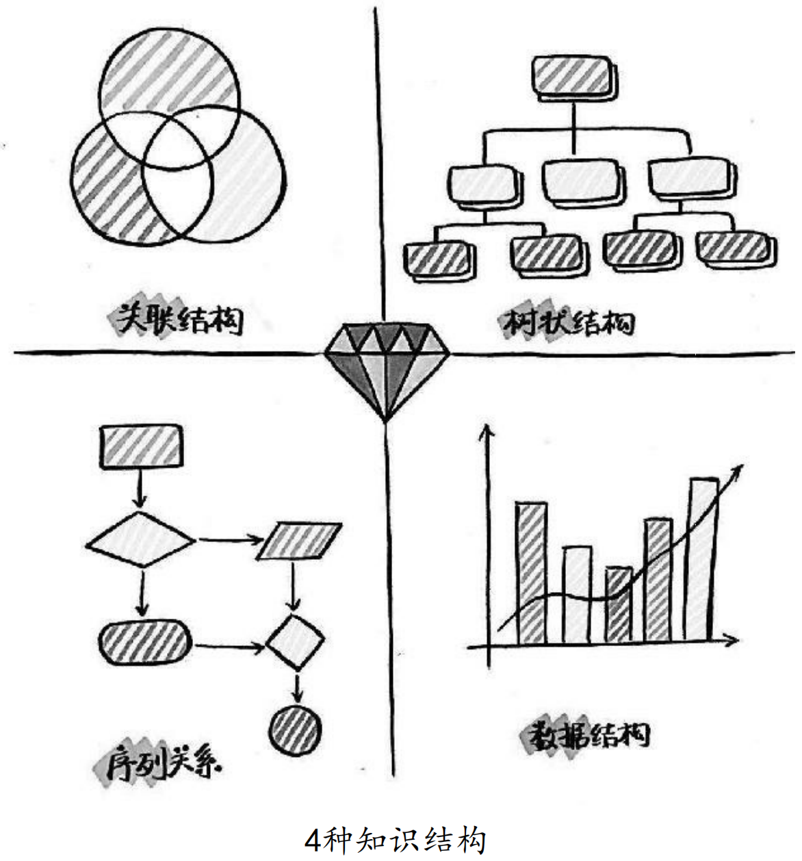 4中常见的知识结构:关联、树状、序列、数据。