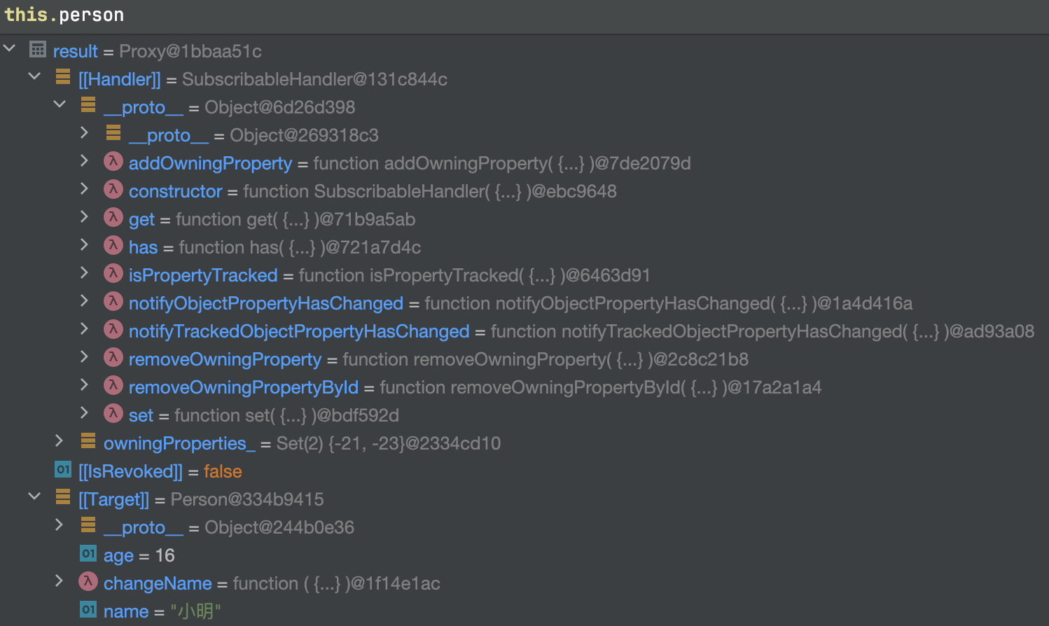 所以在该场景下, changeName中的this指向person对象,而不是被装饰器@State代理的状态变量(proxy对象)。