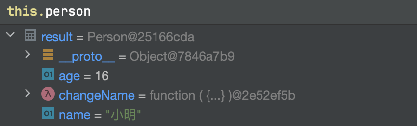 我们通过调试也会发现当断点到changeName方法内时,this是一个普通的person实例对象